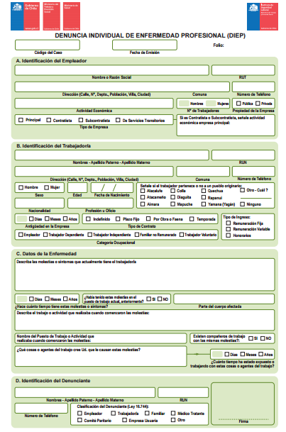 Ante la sospecha de estar afectado por una patología de origen laboral, usted, su empleador o su médico tratante, deben efectuar la denuncia a través del Formulario de Declaración de Enfermedad Profesional (DIEP) ante su mutualidad.